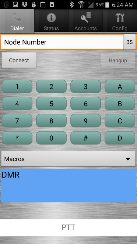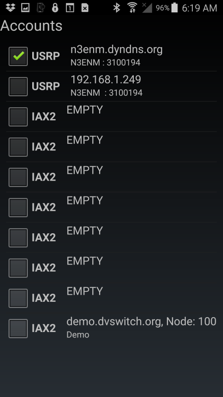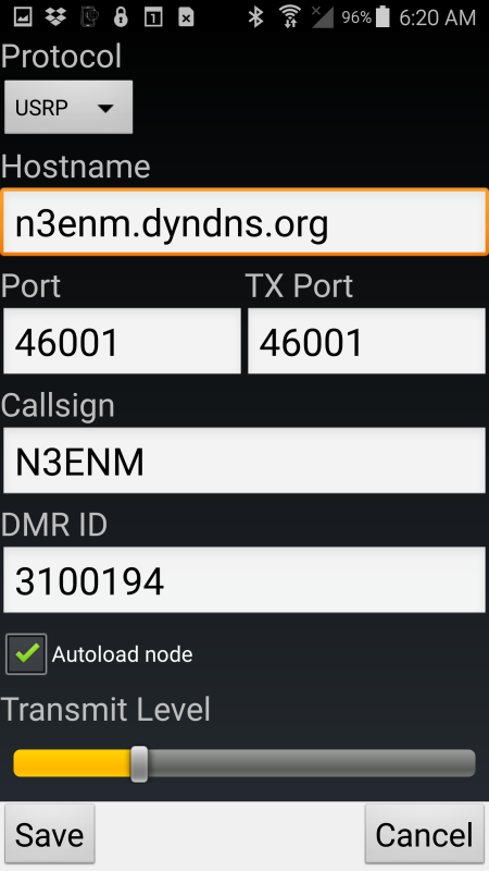 this screenshot DO use "n3enm.dyndns.org" for the Hostname if you want to use my server for a quick test - since the server will only service ONE user at a time it may be unavailable. Please limit use of the server to a short test only. When done press SAVE Press the BACK button on the Android device to return to the main screen (the one with the keypad)