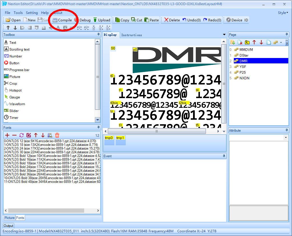 | Using the Nextion Editor The first way to configure the display is to download and run the Nextion Editor - it is available here: https://nextion.itead.cc/resources/download/nextion-editor/ I used version 0.53 Load one of the files from this link https://github.com/g4klx/MMDVMHost/tree/master/Nextion_ON7LDS I used NX4832T035-L3.HMI as I had a 3.5" display - there are other files for 3.2", 2.8" and 2.4" displays. Once the file is loaded you need to hook the display up to your PC via a Serial to USB converter ( I used this one but others should work) To create and install this file follow these steps: