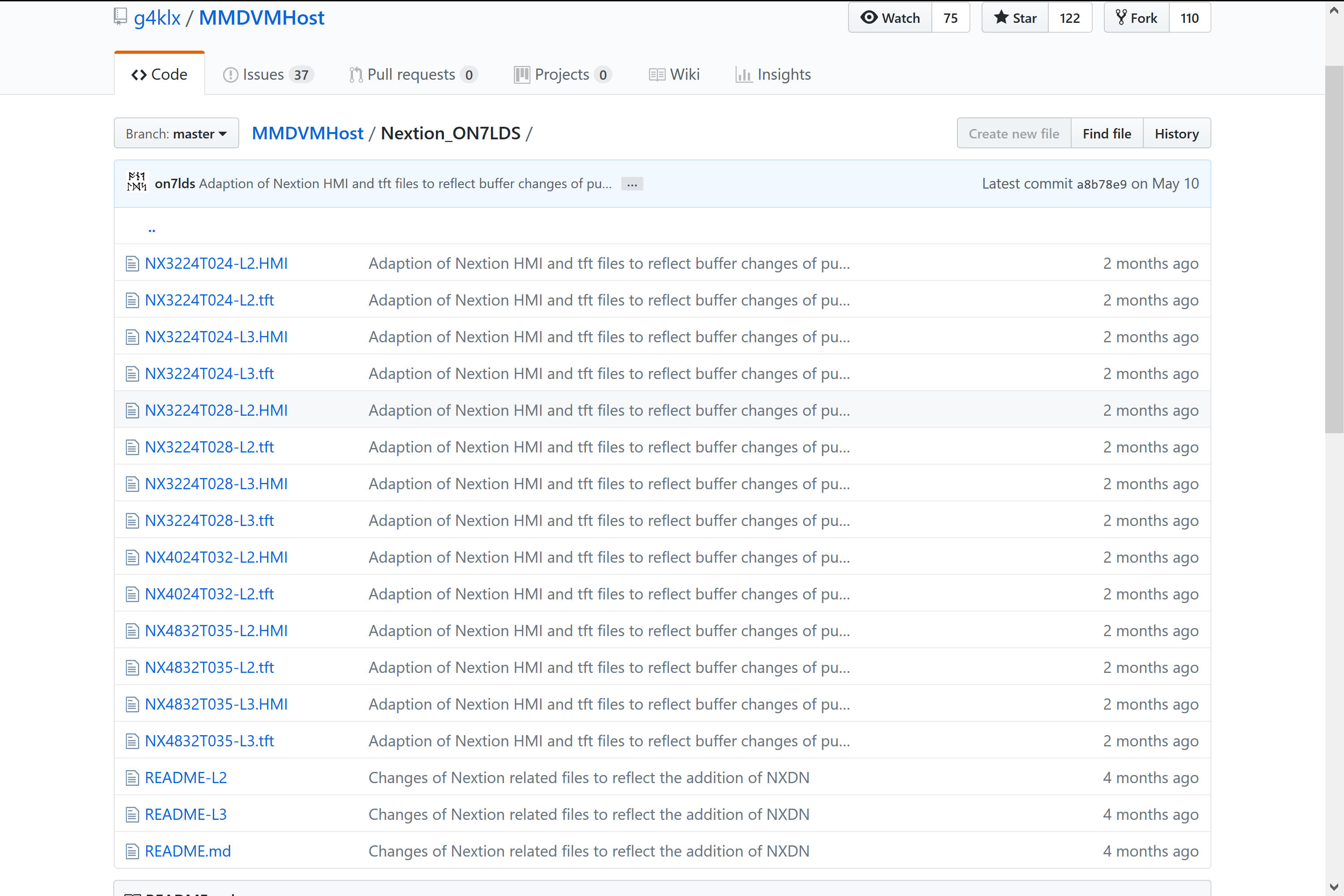 the file into the display. One involves using the Nextion editor. This is the method that should be used if you plan on editing the file. If you just want to get the job done using a microSD card to program the display is easier.Which file do you use? The files that are available on the github page ( https://github.com/g4klx/MMDVMHost/tree/master/Nextion_ON7LDS ) are shown here. The file to use depends on two things. If you are using the Nextion editor to program the display use one of the files that ends with HMI. If you are using the microSD card method of installing the file use one of the files that ends in TFT.