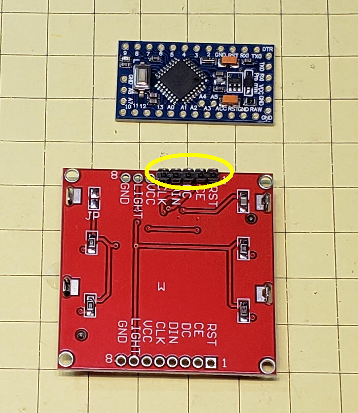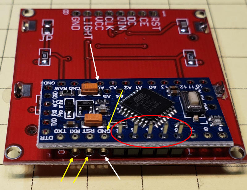 Solder the 5 pins (circled in red) to both the Arduino and the display. The three pins shown by the yellow arrows are connected and the two pins shown by the white arrows are also connected.