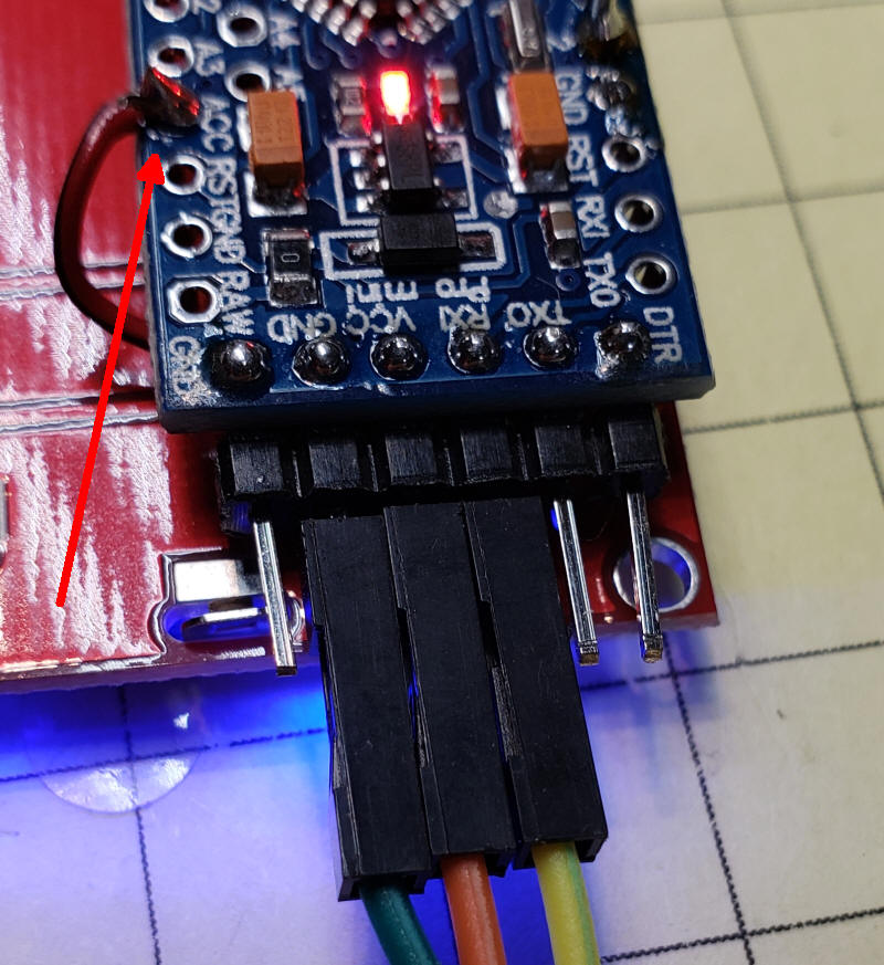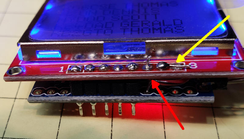 This photo shows the connections after soldering. The red wire (red arrow) goes under the board and connects to the Arduino's VCC (5 volt) pin. The two pins by the yellow arrow are joined together and then go to ground on the Arduino.