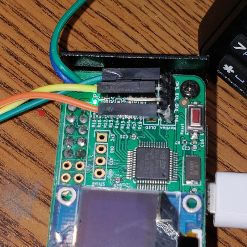 CONNECT TO JUMBO SPOT The connection to the Jumbo Spot are shown here. I soldered a 4 pin angled header to the top board and use that to connect to either the Nextion or to the Nokia display. Only 3 or the 4 wires are needed, VCC, GND and TXD.