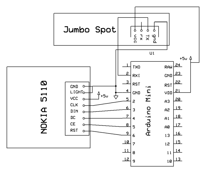 My notes on how this was built appear here. This is not meant to be a thorough tutorial on the display, Arduino and associated software. If you want to try this yourself you should have some understanding of programming an Arduino and soldering the Nokia display, the Arduino and the Jumbo Spot. |