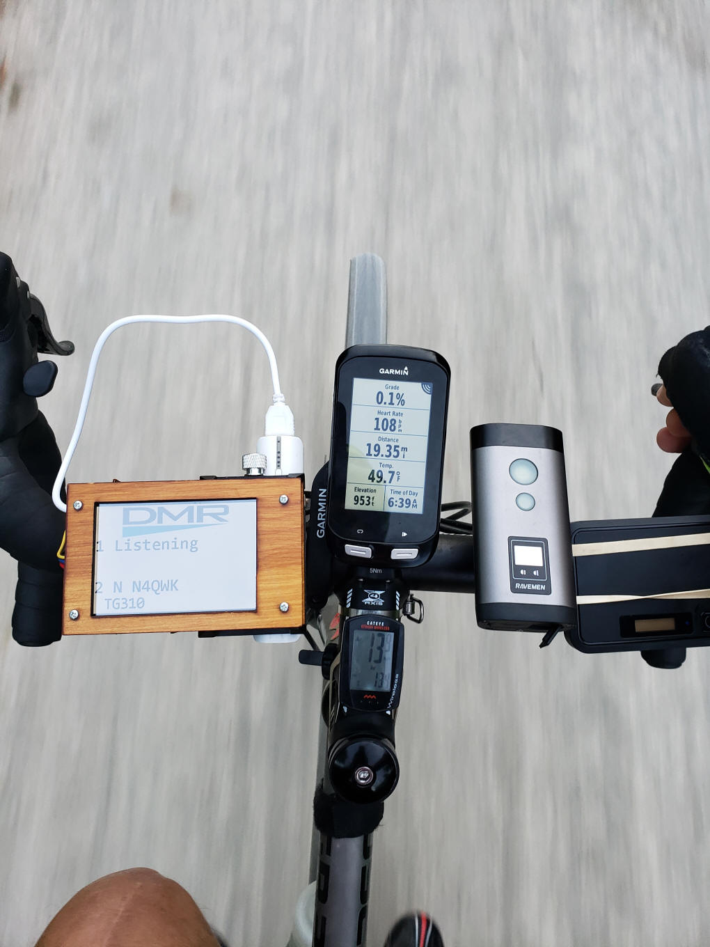 My bicycle mobile setup - On the left is a Jumbo Spot under Nextion display. The white object is a battery pack to power the Jumbo Spot. The black box at the right is a FreedomPop cellular hot spot.