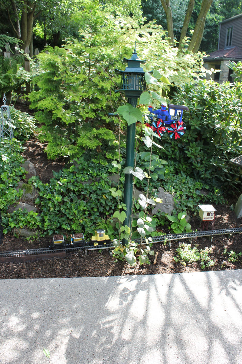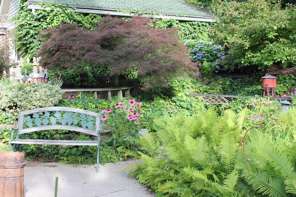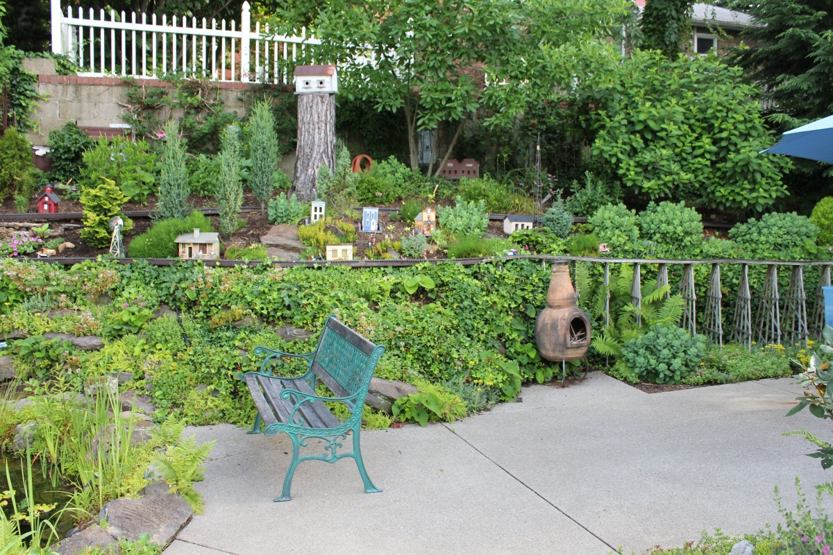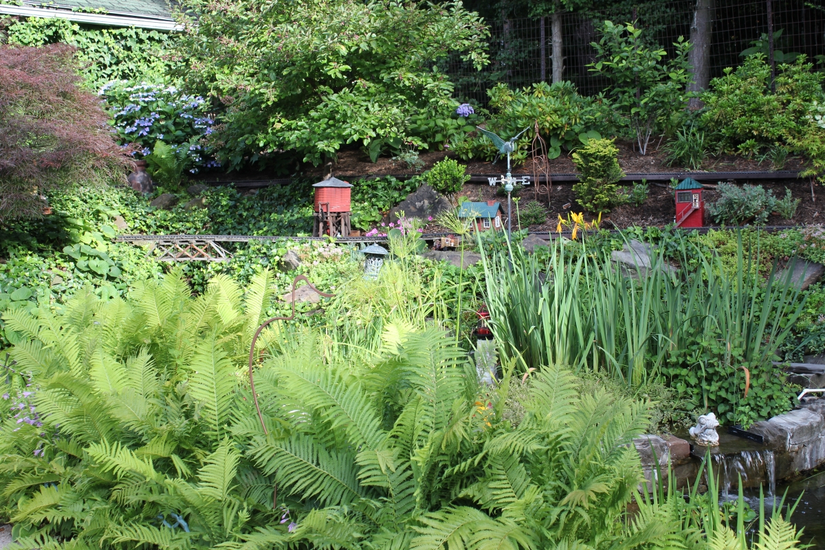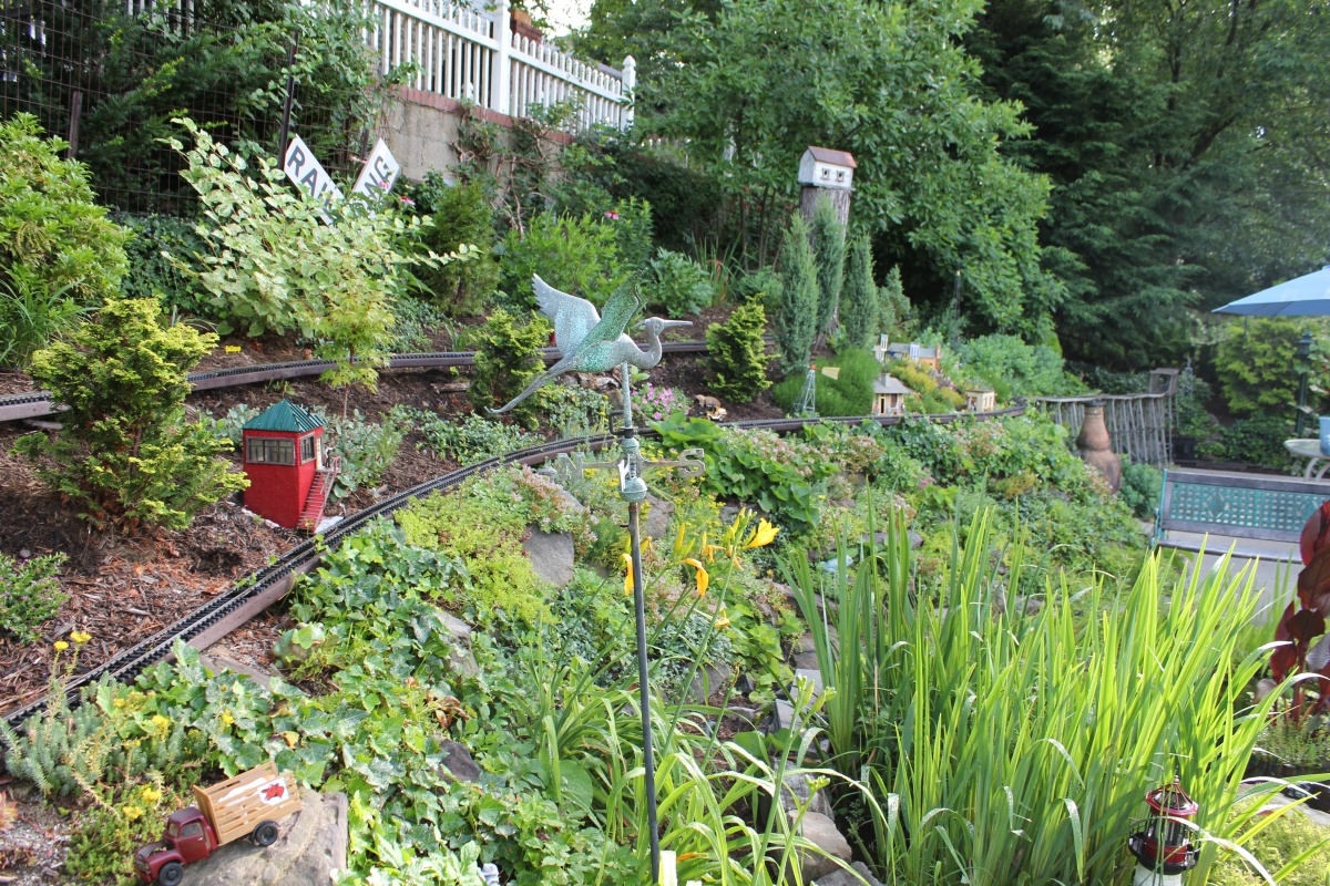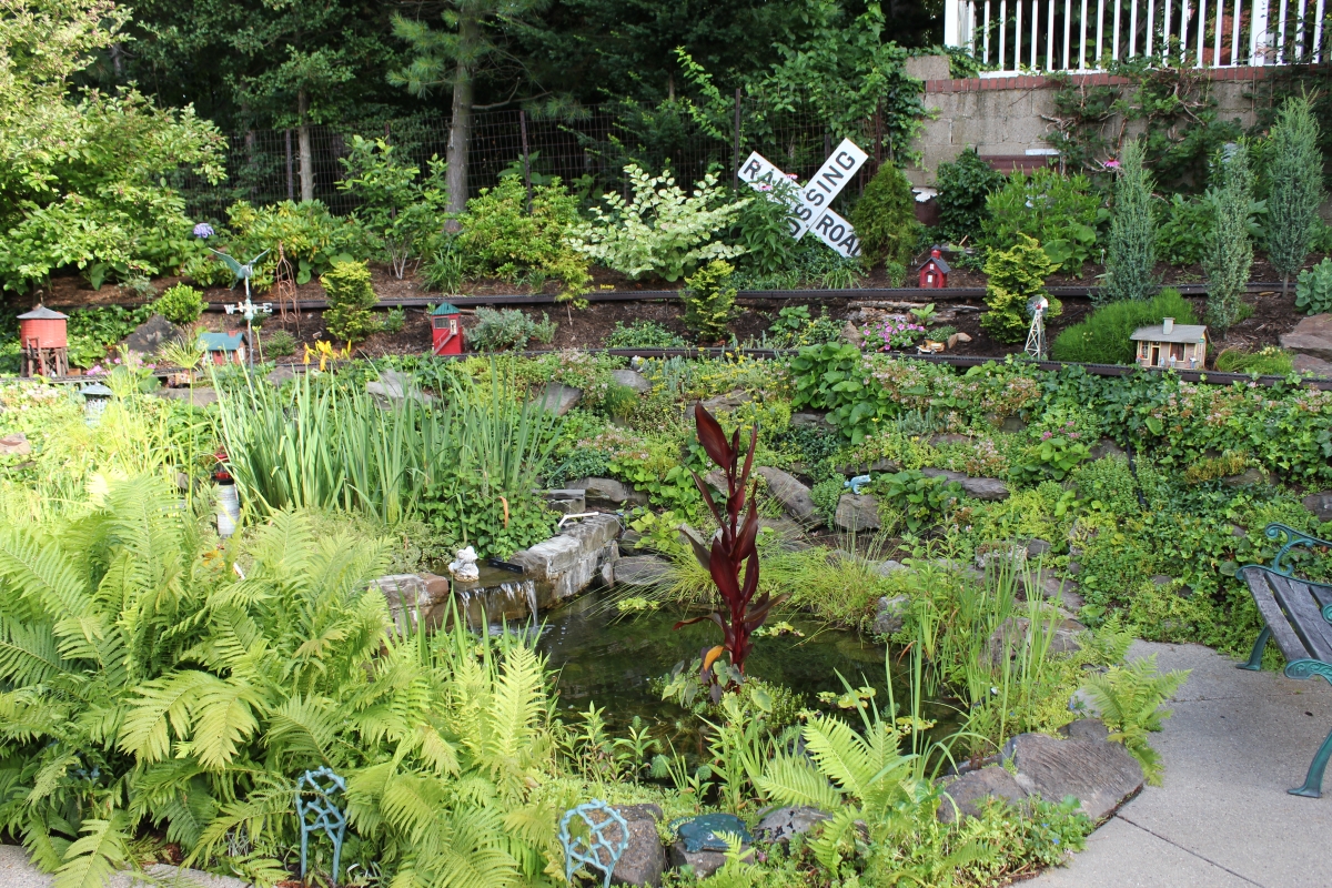 After purchasing their 1920’s bungalow ten years ago, Dave and Lois began extensive work renovating the landscape surrounding their new home. They saw enormous potential in the small hillside backyard. Some of the initial work included removing eight overgrown or dying trees and restoring the garden pond that had been filled in for decades. Dave, an active woodworker, removed an old wooden hot tub and salvaged its Jarrah wood for later use with the garden railroad, a G-scale model that winds its way through the new backyard. A perennial garden established along the left of the driveway includes daylilies, coneflowers, daisies, mums, asters, stonecrop, amsonia, bee balm, and phlox. The area to the right of the driveway has a variety of shrubs including peonies, clethra, lavender, anemone. A thoughtful addition among the shrubs is a dawn redwood, a deciduous conifer tree that sheds its reddish orange needles in the fall. Once climbing up the stairs to the backyard, the visitor is greeted with lush green plants that thrive in lower light conditions, such as ferns, hostas, ivy and hydrangeas. Rose bushes, daphne and lilac trees lend fragrance through the summer months. The centerpiece of the backyard is the 650 gallon pond that provides an environment for fish, frogs, floating plants and potted aquatic plants. Numerous large birds, such as herons and hawks, have paid visit to the pond and its inhabitants. One-third of the pond’s area is made up of a filtering bog full of plants and over 1000 pounds of lava rock that make up a well balanced biological filter. This system works so well it has not needed to be cleaned or disturbed in its nine year lifetime. The garden railroad is seamlessly integrated into the complex hillside topography. With virtually no flat ground for the tracks, the route is made up of many trestles and two bridges built from the reclaimed hot tub’s wood. As the garden trains navigate over 200 feet of track, they pass by the pond, go through two tunnels and visit two small towns. The business of the railroad is to transport coffee beans throughout the route. A second, smaller and more whimsical train starts inside of the coffee mine and carries prehistoric coffee beans to the coffee refinery. You can also see an espresso well that pumps Cretaceous Caffeine! |