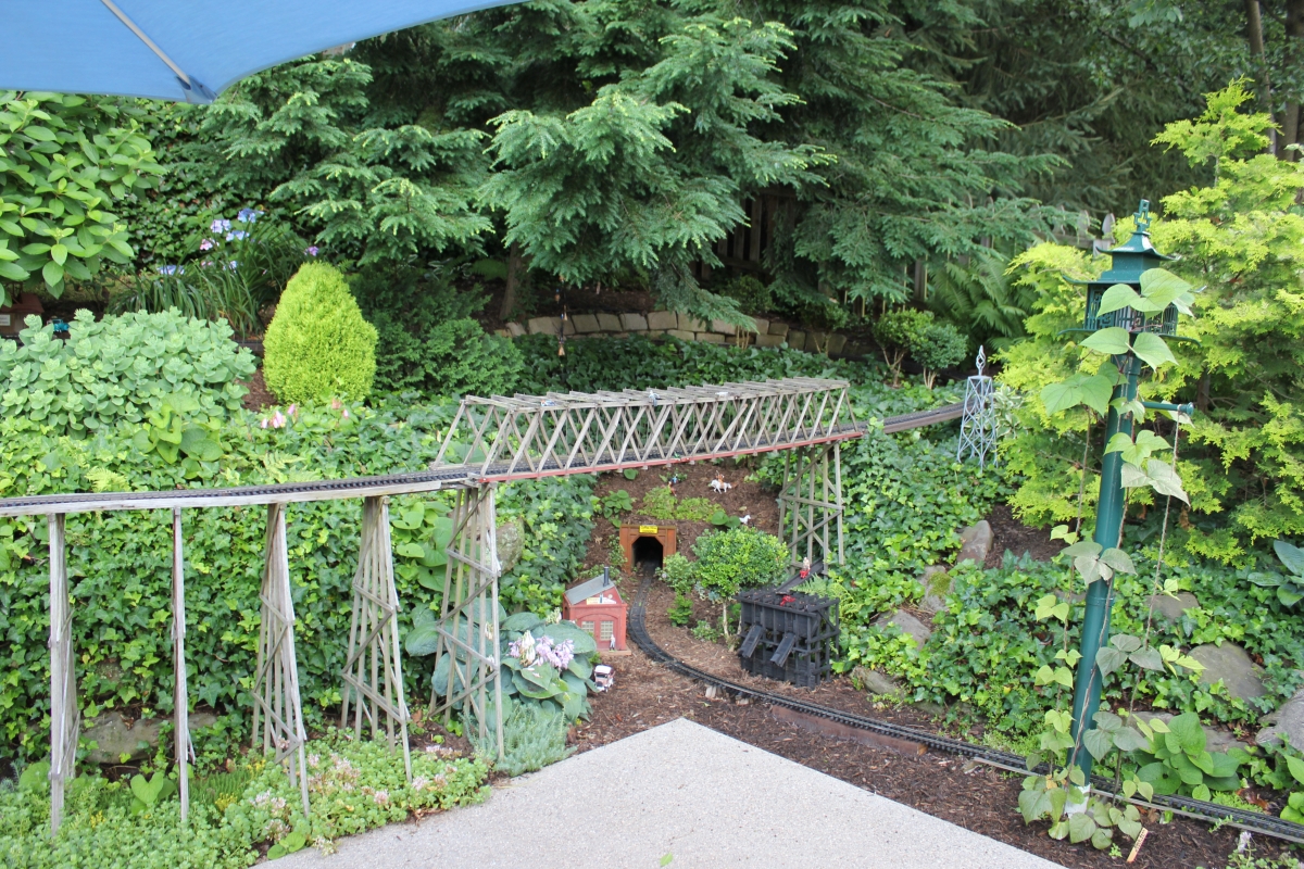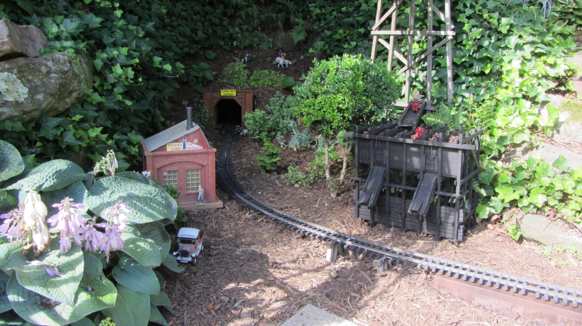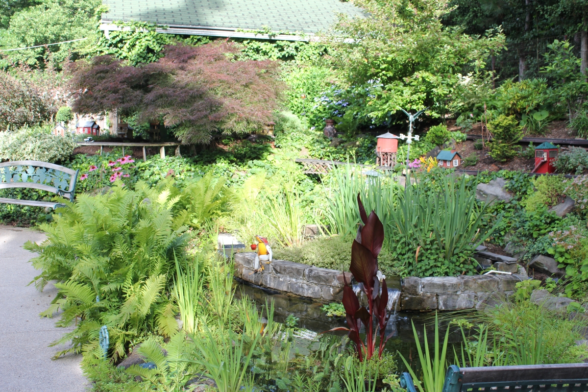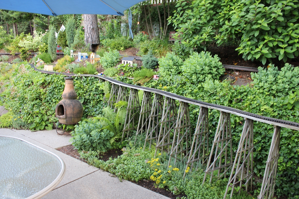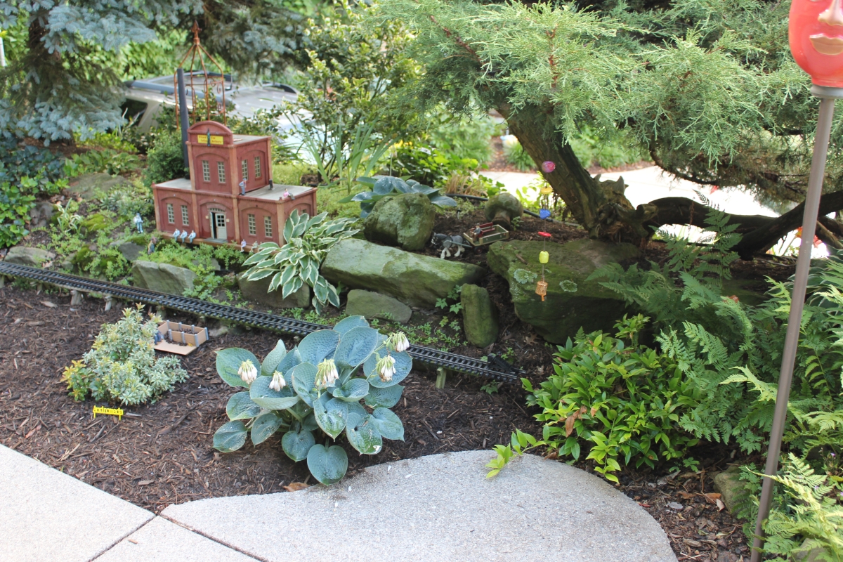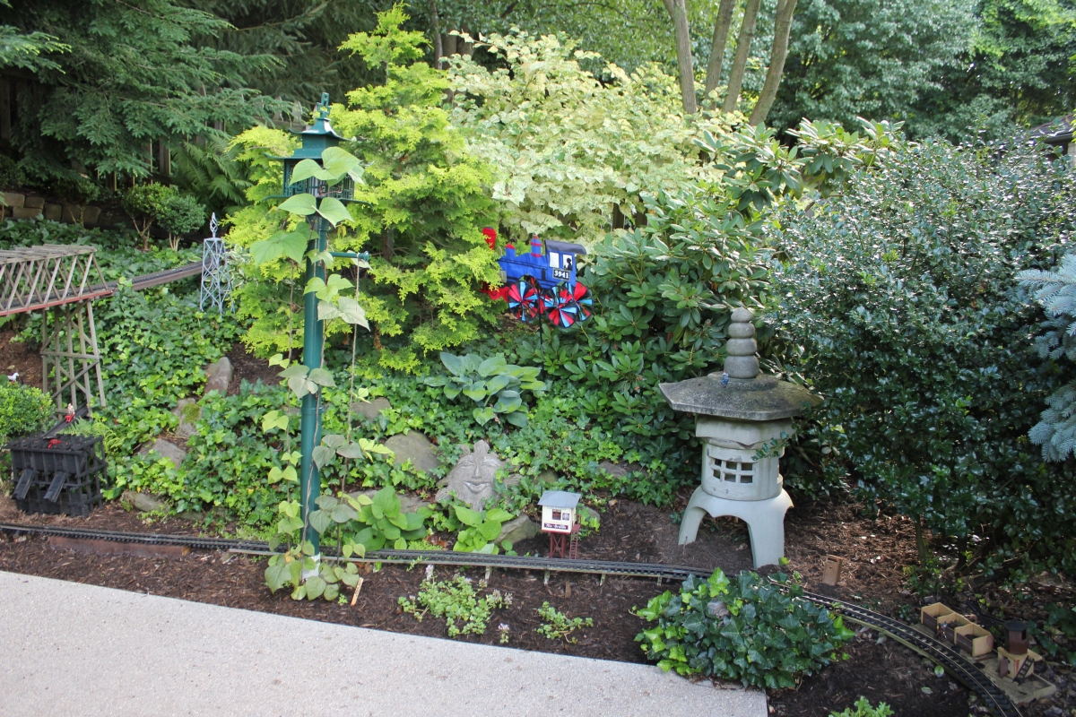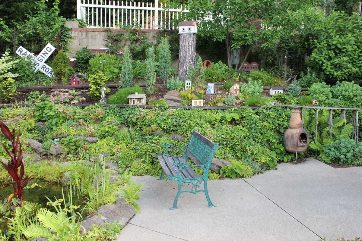 After purchasing their 1920’s bungalow ten years ago, Dave and Lois began extensive work renovating the landscape surrounding their new home. They saw enormous potential in the small hillside backyard. Some of the initial work included removing eight overgrown or dying trees and restoring the garden pond that had been filled in for decades. Dave, an active woodworker, removed an old wooden hot tub and salvaged its Jarrah wood for later use with the garden railroad, a G-scale model that winds its way through the new backyard. A perennial garden established along the left of the driveway includes daylilies, coneflowers, daisies, mums, asters, stonecrop, amsonia, bee balm, and phlox. The area to the right of the driveway has a variety of shrubs including peonies, clethra, lavender, anemone. A thoughtful addition among the shrubs is a dawn redwood, a deciduous conifer tree that sheds its reddish orange needles in the fall. Once climbing up the stairs to the backyard, the visitor is greeted with lush green plants that thrive in lower light conditions, such as ferns, hostas, ivy and hydrangeas. Rose bushes, daphne and lilac trees lend fragrance through the summer months. The centerpiece of the backyard is the 650 gallon pond that provides an environment for fish, frogs, floating plants and potted aquatic plants. Numerous large birds, such as herons and hawks, have paid visit to the pond and its inhabitants. One-third of the pond’s area is made up of a filtering bog full of plants and over 1000 pounds of lava rock that make up a well balanced biological filter. This system works so well it has not needed to be cleaned or disturbed in its nine year lifetime. The garden railroad is seamlessly integrated into the complex hillside topography. With virtually no flat ground for the tracks, the route is made up of many trestles and two bridges built from the reclaimed hot tub’s wood. As the garden trains navigate over 200 feet of track, they pass by the pond, go through two tunnels and visit two small towns. The business of the railroad is to transport coffee beans throughout the route. A second, smaller and more whimsical train starts inside of the coffee mine and carries prehistoric coffee beans to the coffee refinery. You can also see an espresso well that pumps Cretaceous Caffeine! |