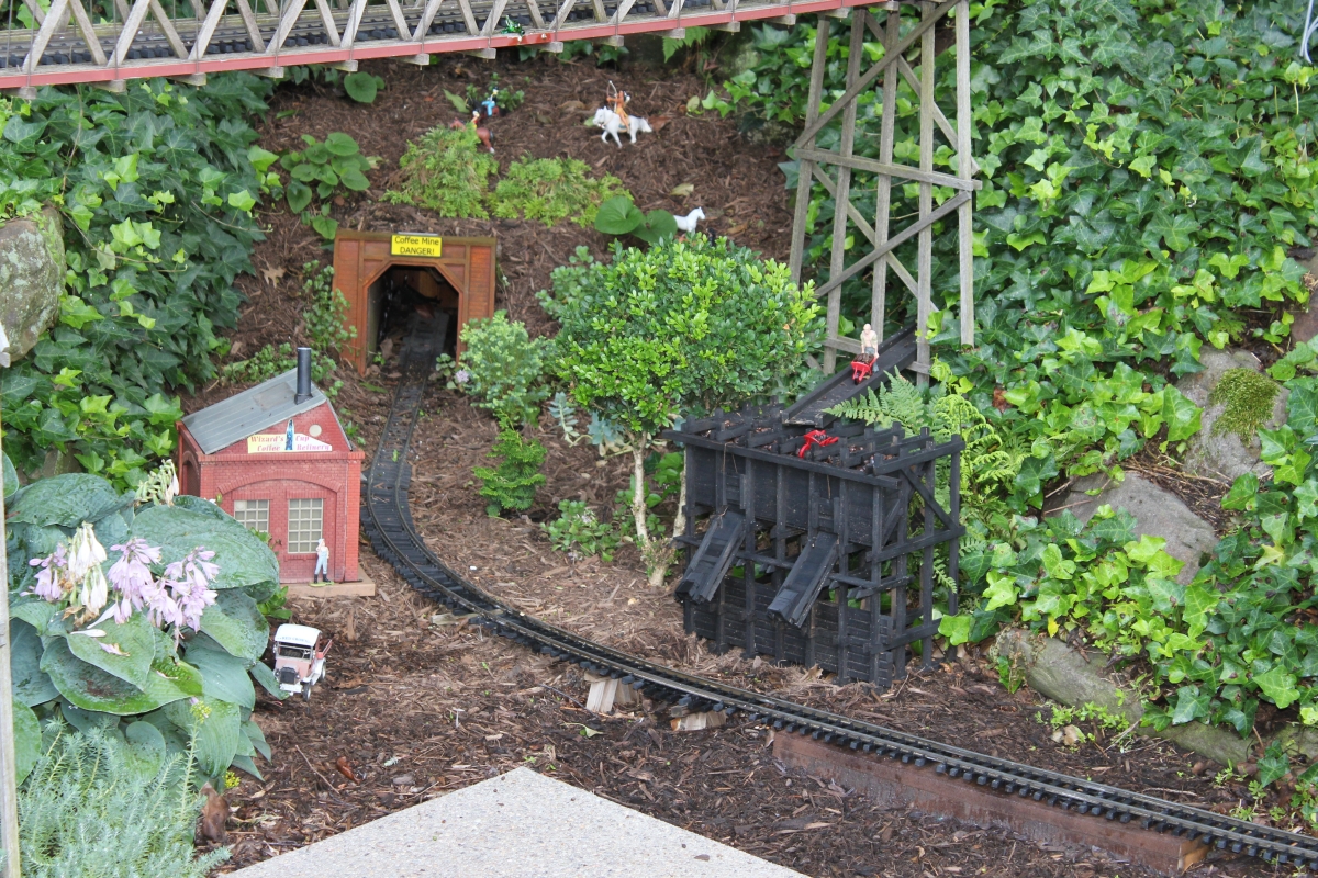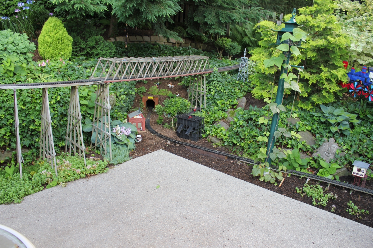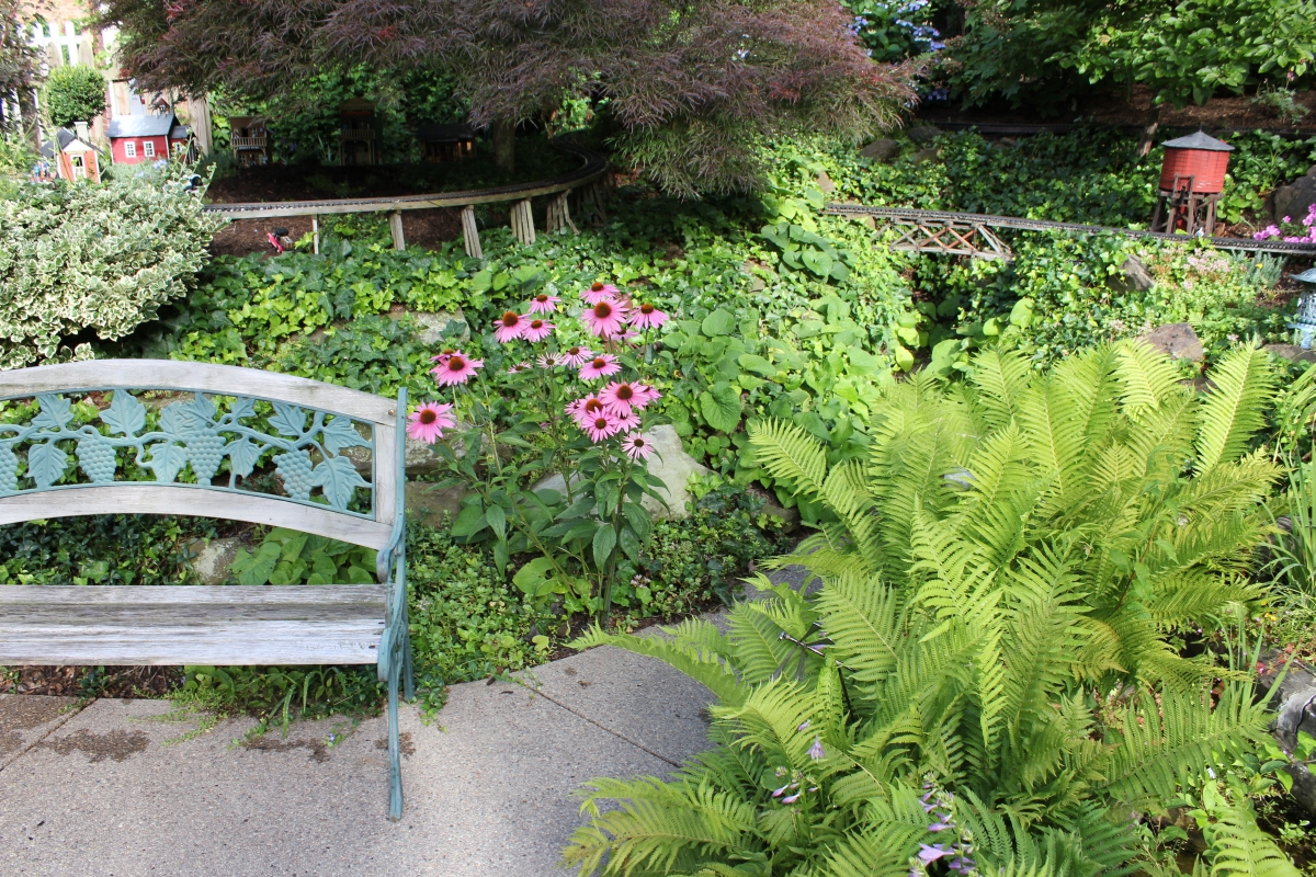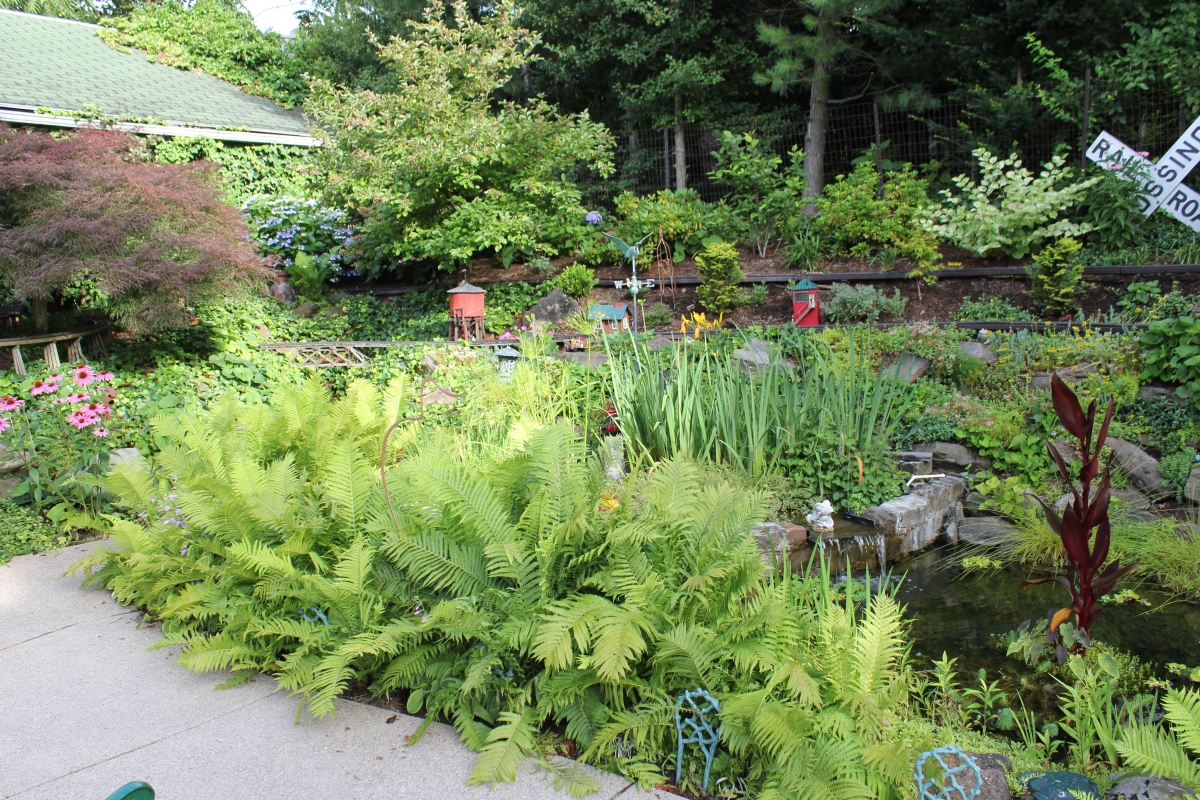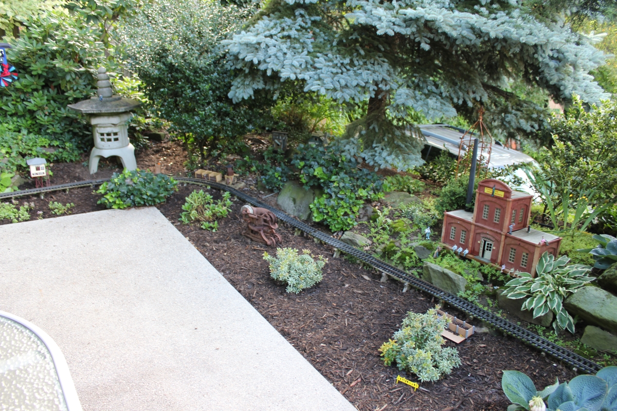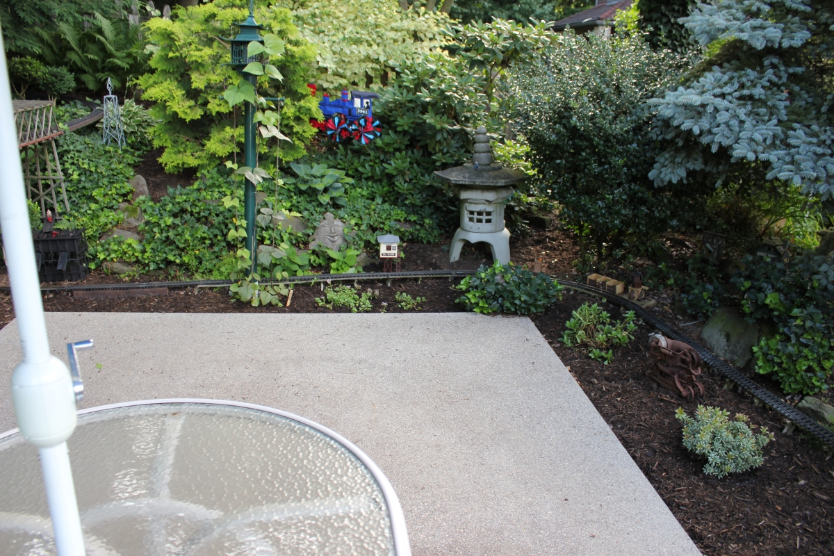 After purchasing their 1920’s bungalow ten years ago, Dave and Lois began extensive work renovating the landscape surrounding their new home. They saw enormous potential in the small hillside backyard. Some of the initial work included removing eight overgrown or dying trees and restoring the garden pond that had been filled in for decades. Dave, an active woodworker, removed an old wooden hot tub and salvaged its Jarrah wood for later use with the garden railroad, a G-scale model that winds its way through the new backyard. A perennial garden established along the left of the driveway includes daylilies, coneflowers, daisies, mums, asters, stonecrop, amsonia, bee balm, and phlox. The area to the right of the driveway has a variety of shrubs including peonies, clethra, lavender, anemone. A thoughtful addition among the shrubs is a dawn redwood, a deciduous conifer tree that sheds its reddish orange needles in the fall. Once climbing up the stairs to the backyard, the visitor is greeted with lush green plants that thrive in lower light conditions, such as ferns, hostas, ivy and hydrangeas. Rose bushes, daphne and lilac trees lend fragrance through the summer months. The centerpiece of the backyard is the 650 gallon pond that provides an environment for fish, frogs, floating plants and potted aquatic plants. Numerous large birds, such as herons and hawks, have paid visit to the pond and its inhabitants. One-third of the pond’s area is made up of a filtering bog full of plants and over 1000 pounds of lava rock that make up a well balanced biological filter. This system works so well it has not needed to be cleaned or disturbed in its nine year lifetime. The garden railroad is seamlessly integrated into the complex hillside topography. With virtually no flat ground for the tracks, the route is made up of many trestles and two bridges built from the reclaimed hot tub’s wood. As the garden trains navigate over 200 feet of track, they pass by the pond, go through two tunnels and visit two small towns. The business of the railroad is to transport coffee beans throughout the route. A second, smaller and more whimsical train starts inside of the coffee mine and carries prehistoric coffee beans to the coffee refinery. You can also see an espresso well that pumps Cretaceous Caffeine! |