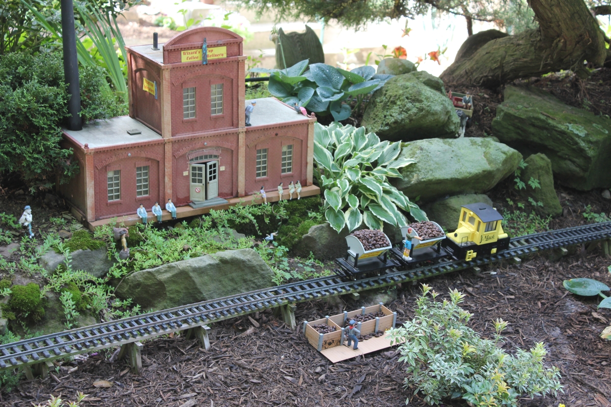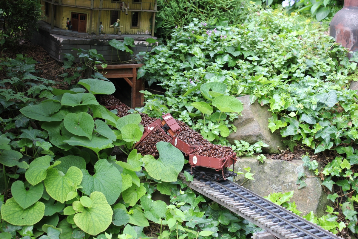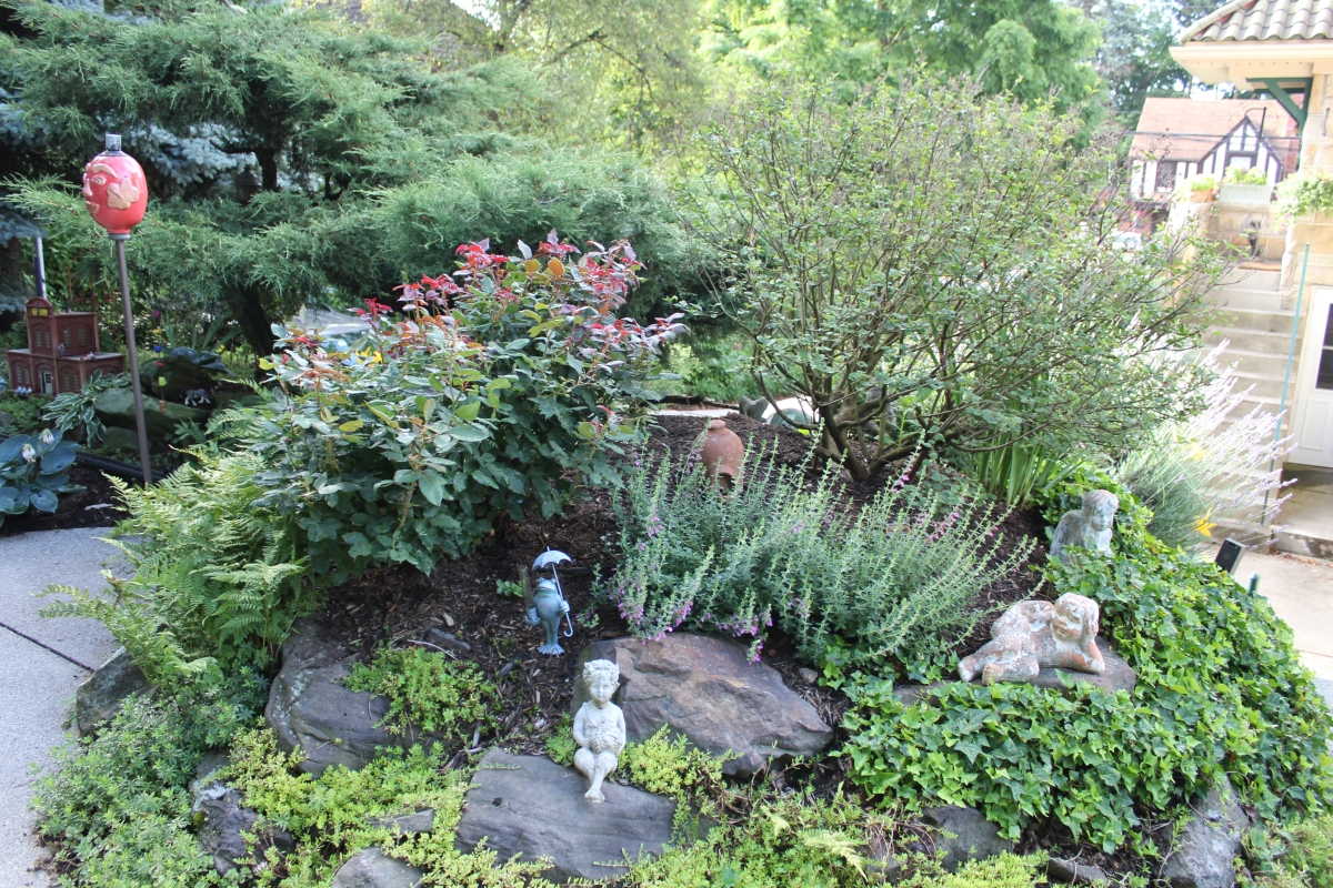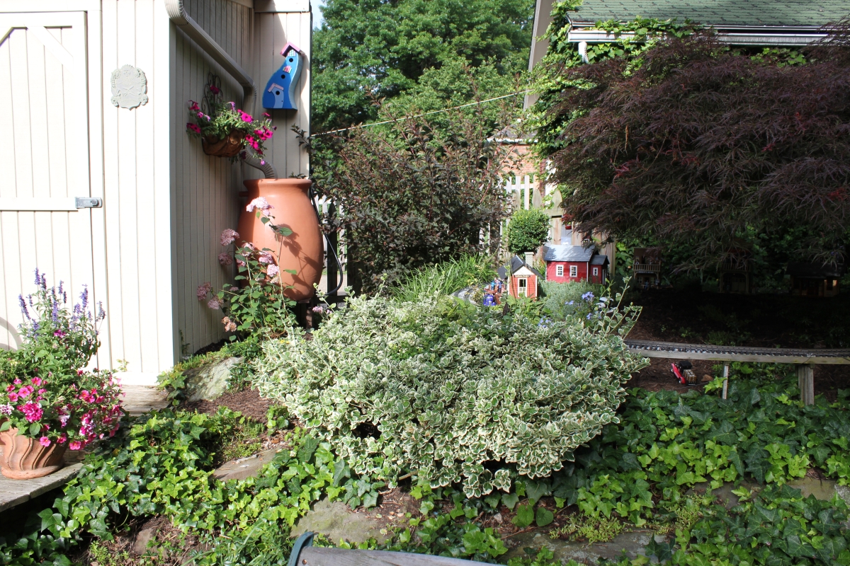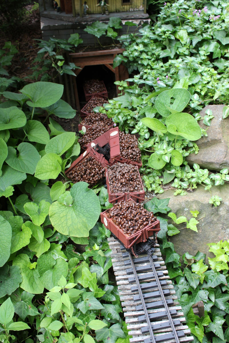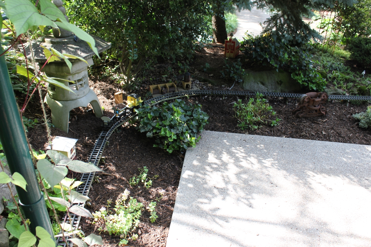 After purchasing their 1920’s bungalow ten years ago, Dave and Lois began extensive work renovating the landscape surrounding their new home. They saw enormous potential in the small hillside backyard. Some of the initial work included removing eight overgrown or dying trees and restoring the garden pond that had been filled in for decades. Dave, an active woodworker, removed an old wooden hot tub and salvaged its Jarrah wood for later use with the garden railroad, a G-scale model that winds its way through the new backyard. A perennial garden established along the left of the driveway includes daylilies, coneflowers, daisies, mums, asters, stonecrop, amsonia, bee balm, and phlox. The area to the right of the driveway has a variety of shrubs including peonies, clethra, lavender, anemone. A thoughtful addition among the shrubs is a dawn redwood, a deciduous conifer tree that sheds its reddish orange needles in the fall. Once climbing up the stairs to the backyard, the visitor is greeted with lush green plants that thrive in lower light conditions, such as ferns, hostas, ivy and hydrangeas. Rose bushes, daphne and lilac trees lend fragrance through the summer months. The centerpiece of the backyard is the 650 gallon pond that provides an environment for fish, frogs, floating plants and potted aquatic plants. Numerous large birds, such as herons and hawks, have paid visit to the pond and its inhabitants. One-third of the pond’s area is made up of a filtering bog full of plants and over 1000 pounds of lava rock that make up a well balanced biological filter. This system works so well it has not needed to be cleaned or disturbed in its nine year lifetime. The garden railroad is seamlessly integrated into the complex hillside topography. With virtually no flat ground for the tracks, the route is made up of many trestles and two bridges built from the reclaimed hot tub’s wood. As the garden trains navigate over 200 feet of track, they pass by the pond, go through two tunnels and visit two small towns. The business of the railroad is to transport coffee beans throughout the route. A second, smaller and more whimsical train starts inside of the coffee mine and carries prehistoric coffee beans to the coffee refinery. You can also see an espresso well that pumps Cretaceous Caffeine! |