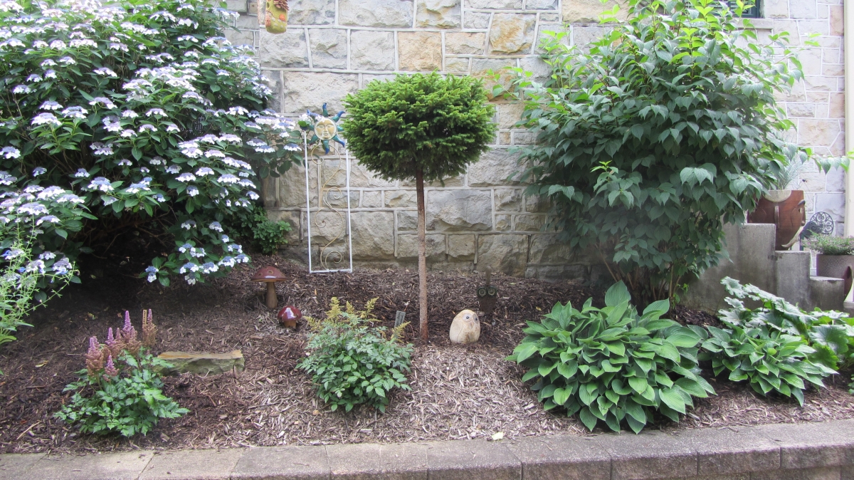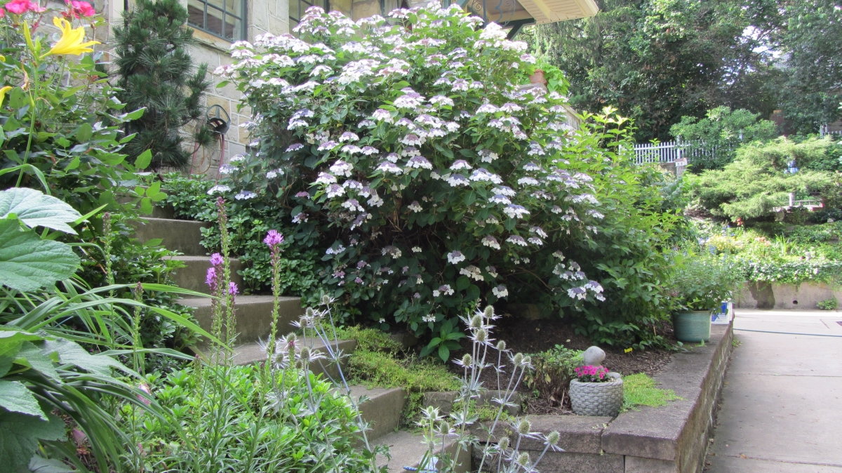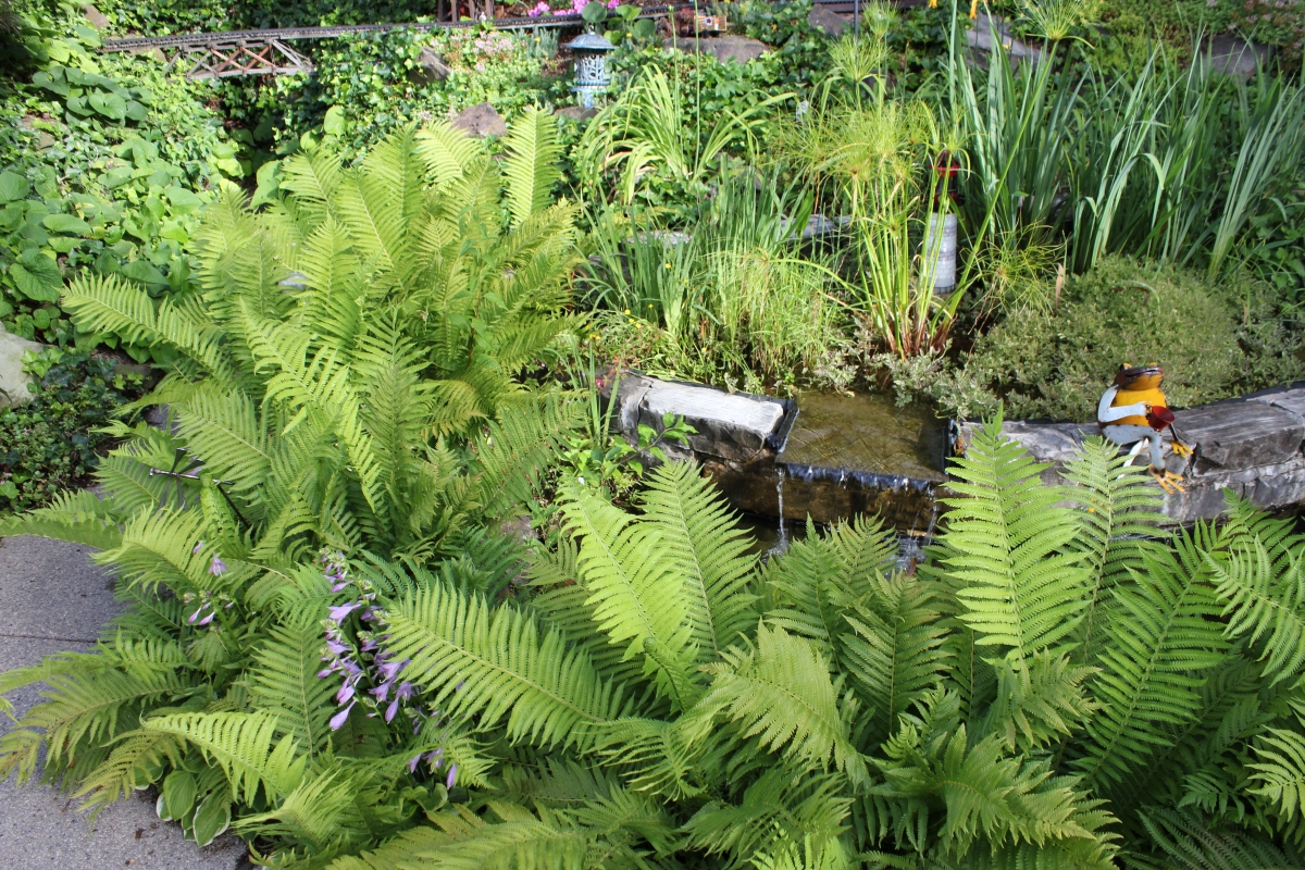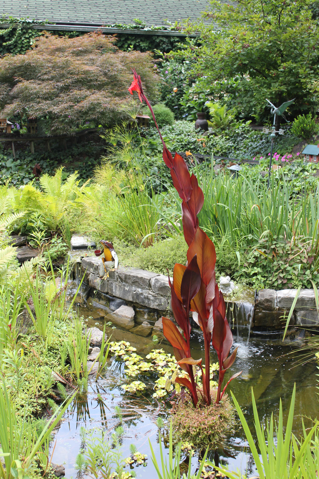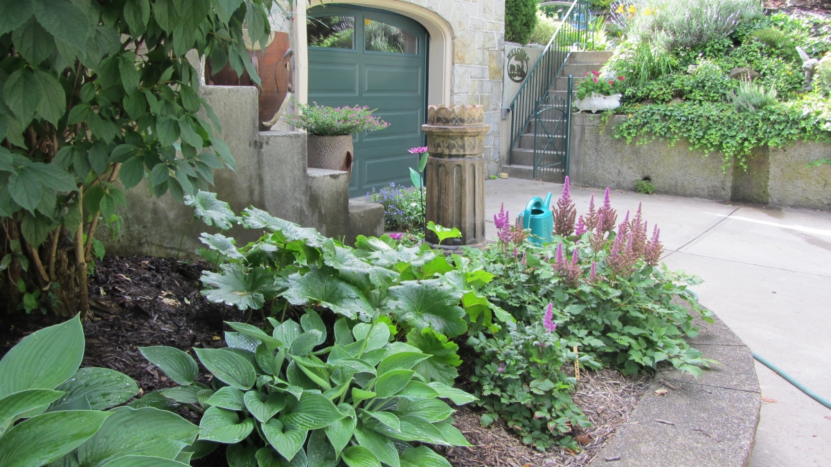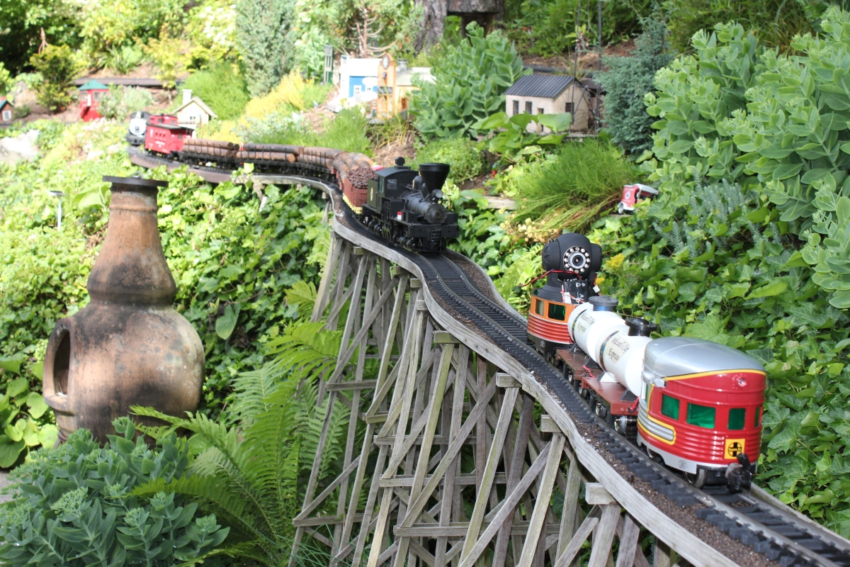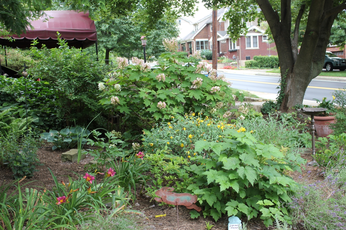 After purchasing their 1920’s bungalow ten years ago, Dave and Lois began extensive work renovating the landscape surrounding their new home. They saw enormous potential in the small hillside backyard. Some of the initial work included removing eight overgrown or dying trees and restoring the garden pond that had been filled in for decades. Dave, an active woodworker, removed an old wooden hot tub and salvaged its Jarrah wood for later use with the garden railroad, a G-scale model that winds its way through the new backyard. A perennial garden established along the left of the driveway includes daylilies, coneflowers, daisies, mums, asters, stonecrop, amsonia, bee balm, and phlox. The area to the right of the driveway has a variety of shrubs including peonies, clethra, lavender, anemone. A thoughtful addition among the shrubs is a dawn redwood, a deciduous conifer tree that sheds its reddish orange needles in the fall. Once climbing up the stairs to the backyard, the visitor is greeted with lush green plants that thrive in lower light conditions, such as ferns, hostas, ivy and hydrangeas. Rose bushes, daphne and lilac trees lend fragrance through the summer months. The centerpiece of the backyard is the 650 gallon pond that provides an environment for fish, frogs, floating plants and potted aquatic plants. Numerous large birds, such as herons and hawks, have paid visit to the pond and its inhabitants. One-third of the pond’s area is made up of a filtering bog full of plants and over 1000 pounds of lava rock that make up a well balanced biological filter. This system works so well it has not needed to be cleaned or disturbed in its nine year lifetime. The garden railroad is seamlessly integrated into the complex hillside topography. With virtually no flat ground for the tracks, the route is made up of many trestles and two bridges built from the reclaimed hot tub’s wood. As the garden trains navigate over 200 feet of track, they pass by the pond, go through two tunnels and visit two small towns. The business of the railroad is to transport coffee beans throughout the route. A second, smaller and more whimsical train starts inside of the coffee mine and carries prehistoric coffee beans to the coffee refinery. You can also see an espresso well that pumps Cretaceous Caffeine! |