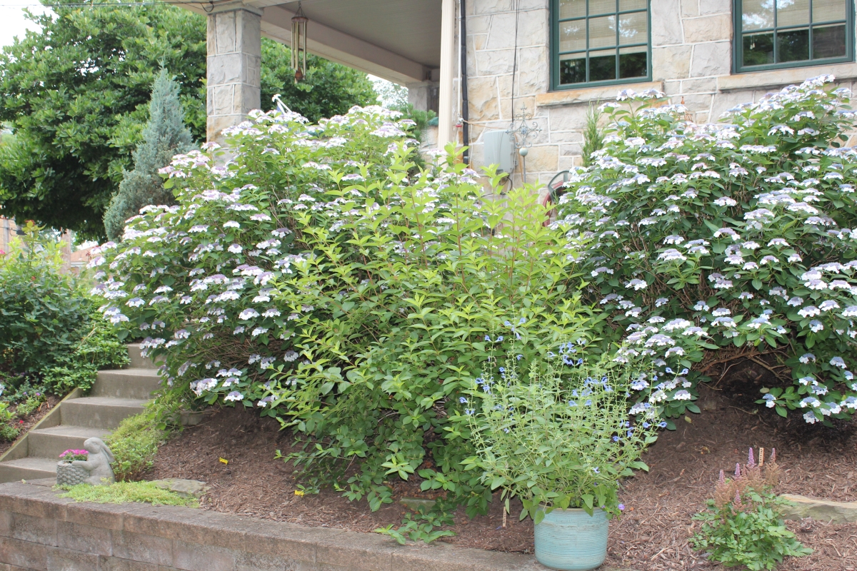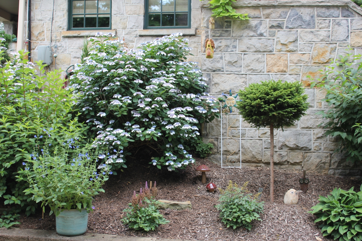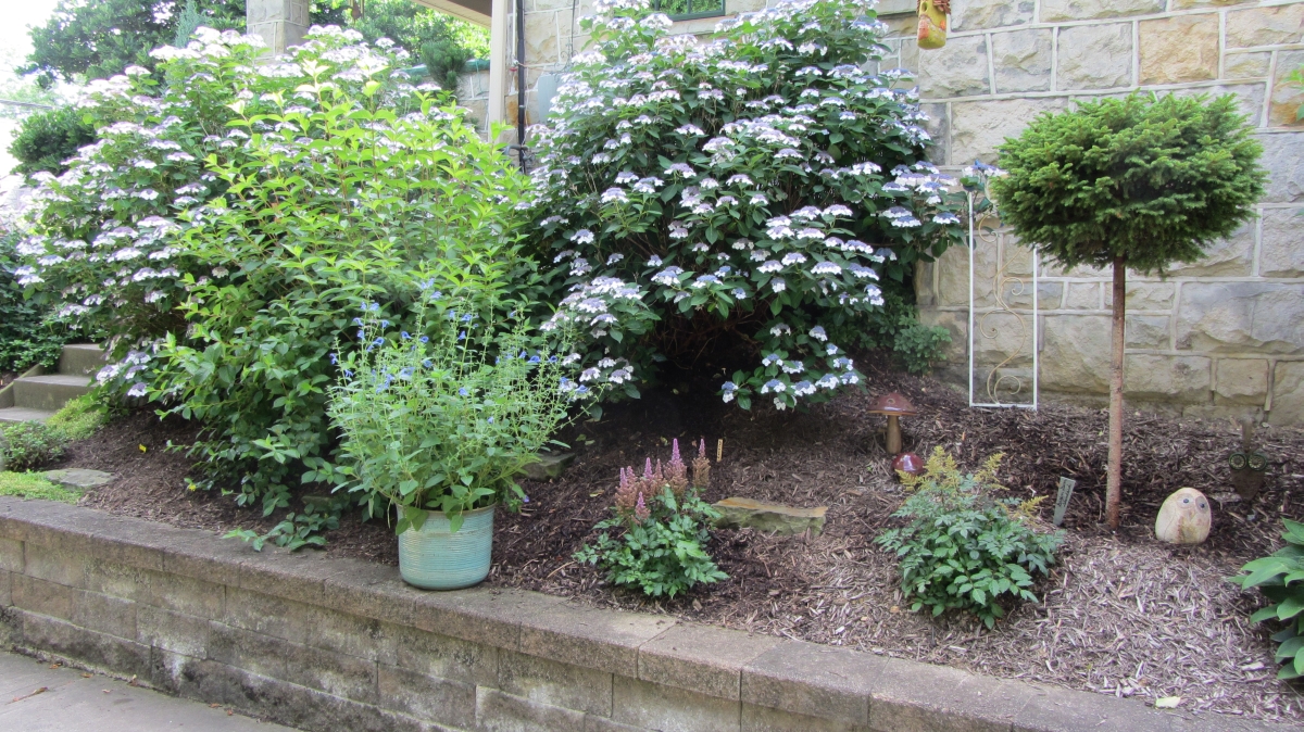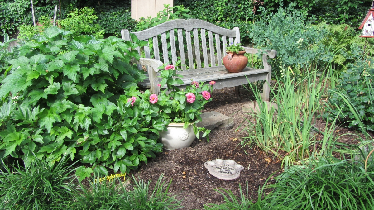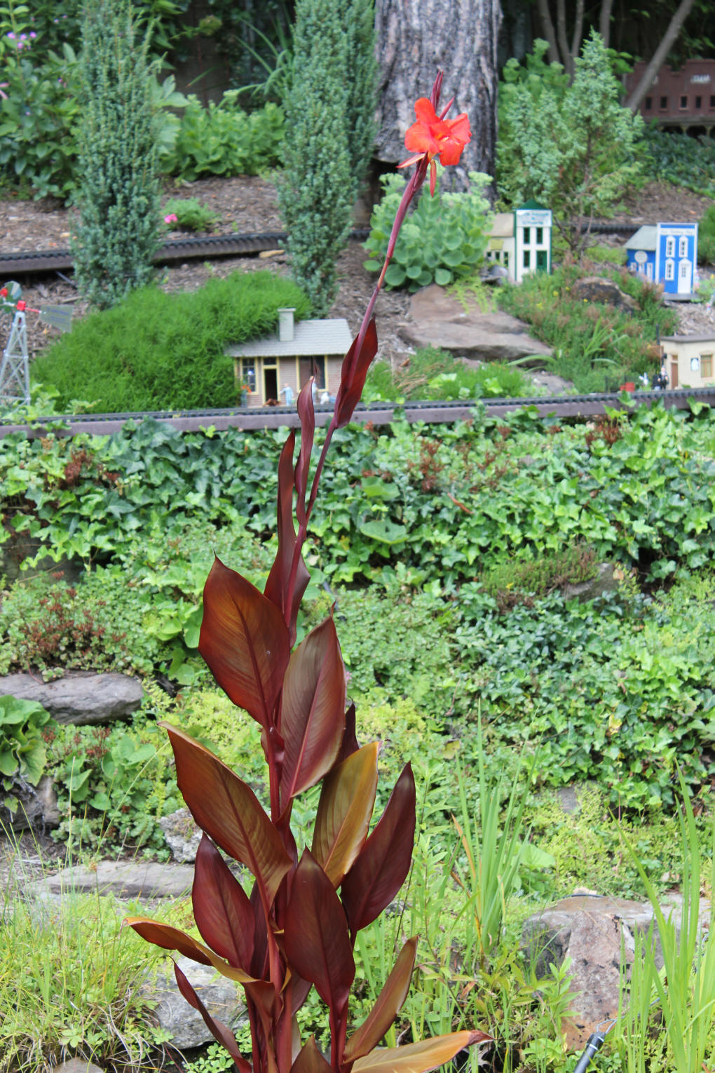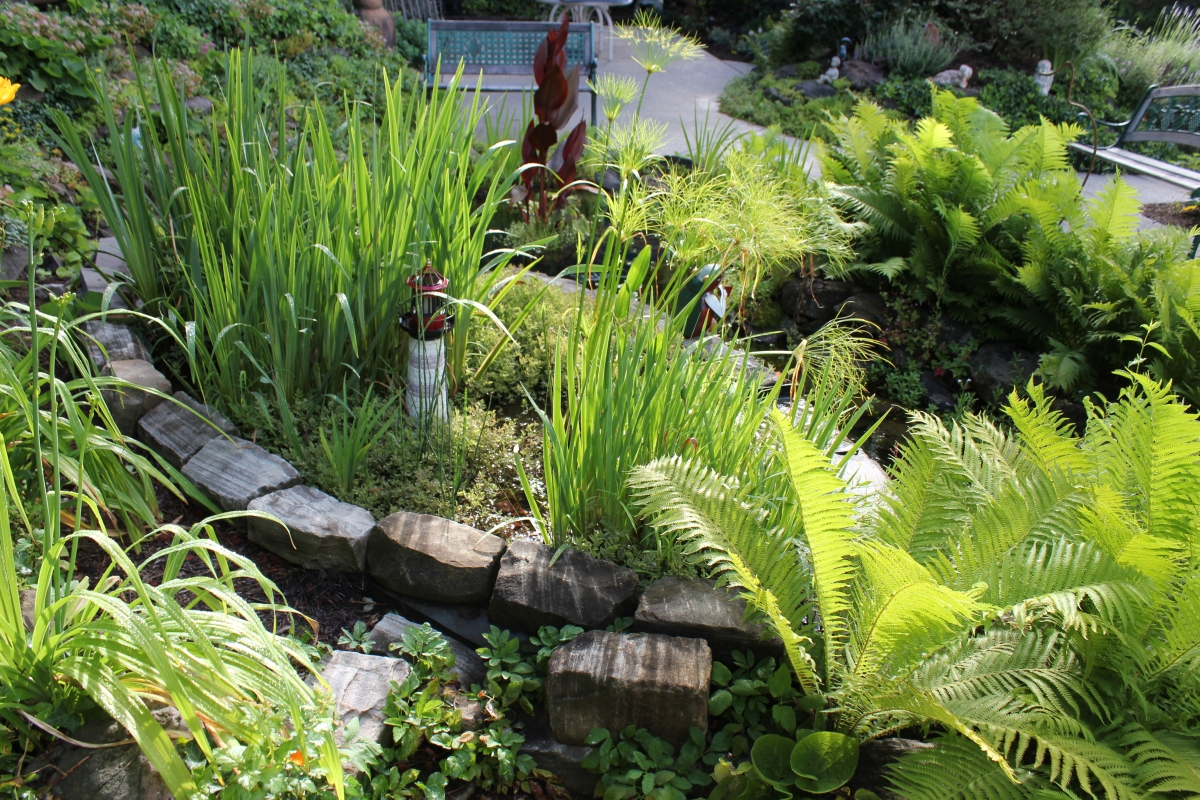After purchasing their 1920’s bungalow ten years ago, Dave and Lois began extensive work renovating the landscape surrounding their new home. They saw enormous potential in the small hillside backyard. Some of the initial work included removing eight overgrown or dying trees and restoring the garden pond that had been filled in for decades. Dave, an active woodworker, removed an old wooden hot tub and salvaged its Jarrah wood for later use with the garden railroad, a G-scale model that winds its way through the new backyard. A perennial garden established along the left of the driveway includes daylilies, coneflowers, daisies, mums, asters, stonecrop, amsonia, bee balm, and phlox. The area to the right of the driveway has a variety of shrubs including peonies, clethra, lavender, anemone. A thoughtful addition among the shrubs is a dawn redwood, a deciduous conifer tree that sheds its reddish orange needles in the fall. Once climbing up the stairs to the backyard, the visitor is greeted with lush green plants that thrive in lower light conditions, such as ferns, hostas, ivy and hydrangeas. Rose bushes, daphne and lilac trees lend fragrance through the summer months. The centerpiece of the backyard is the 650 gallon pond that provides an environment for fish, frogs, floating plants and potted aquatic plants. Numerous large birds, such as herons and hawks, have paid visit to the pond and its inhabitants. One-third of the pond’s area is made up of a filtering bog full of plants and over 1000 pounds of lava rock that make up a well balanced biological filter. This system works so well it has not needed to be cleaned or disturbed in its nine year lifetime. The garden railroad is seamlessly integrated into the complex hillside topography. With virtually no flat ground for the tracks, the route is made up of many trestles and two bridges built from the reclaimed hot tub’s wood. As the garden trains navigate over 200 feet of track, they pass by the pond, go through two tunnels and visit two small towns. The business of the railroad is to transport coffee beans throughout the route. A second, smaller and more whimsical train starts inside of the coffee mine and carries prehistoric coffee beans to the coffee refinery. You can also see an espresso well that pumps Cretaceous Caffeine! |