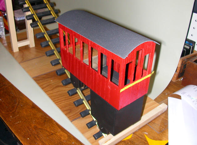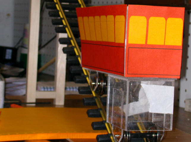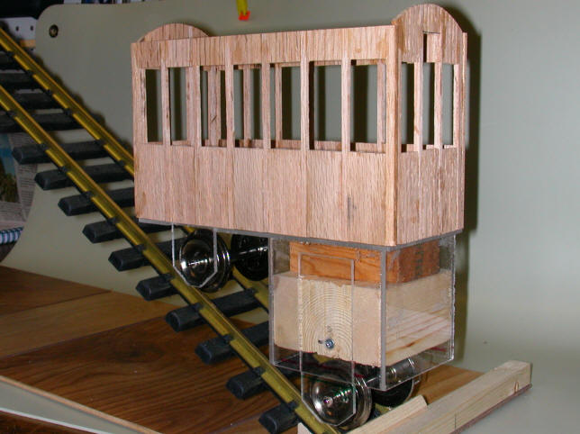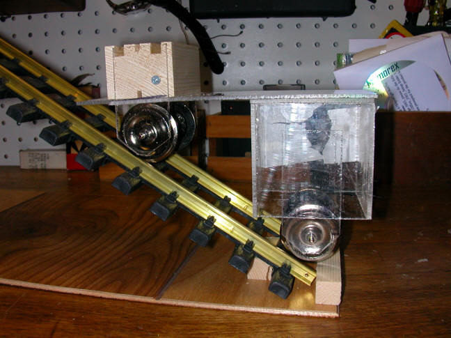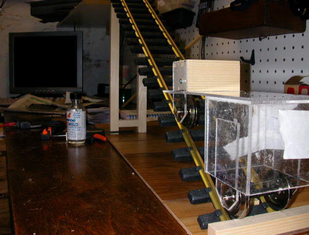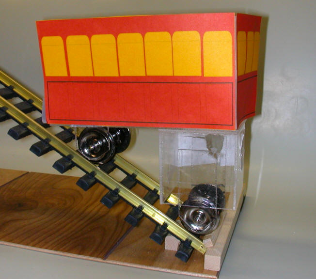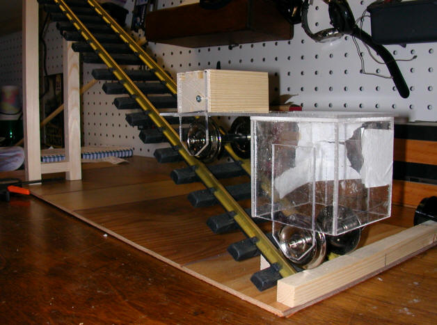The photo below shows the first try at a Plexiglas mock up of the incline car. The track is at a 30 degree angle. The right portion of the car was once used for storage. The cabin is not yet installed.
