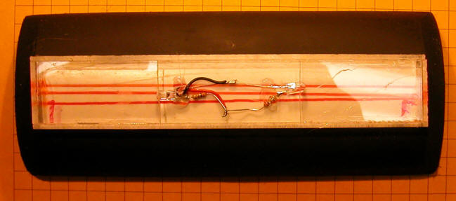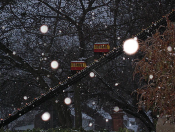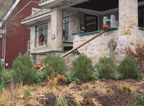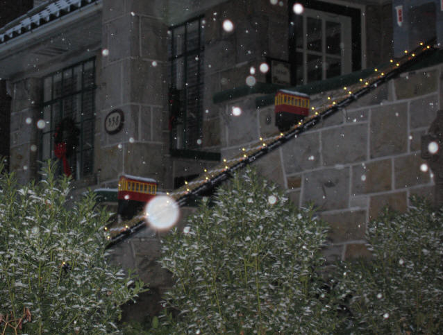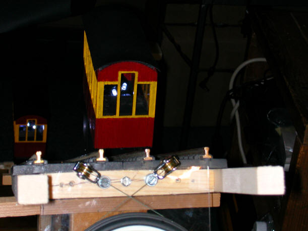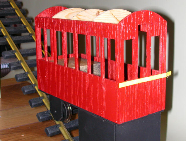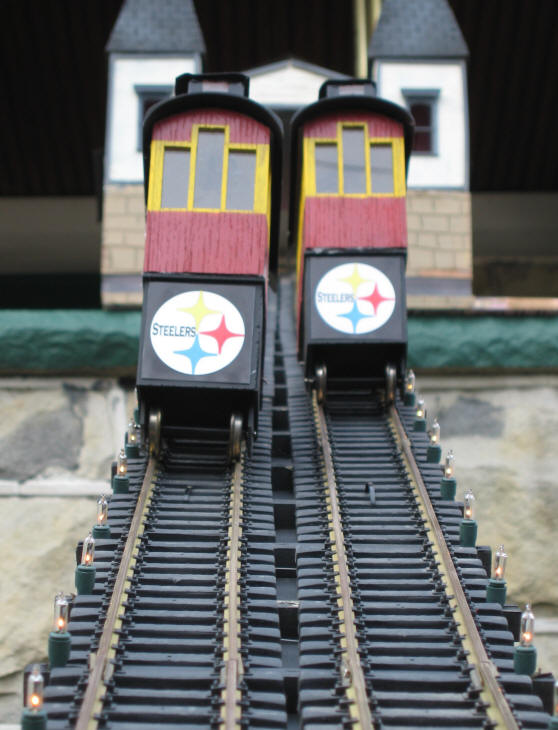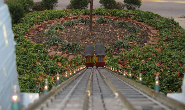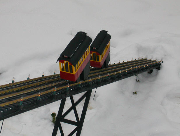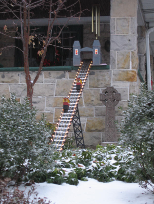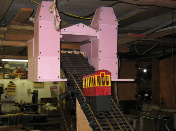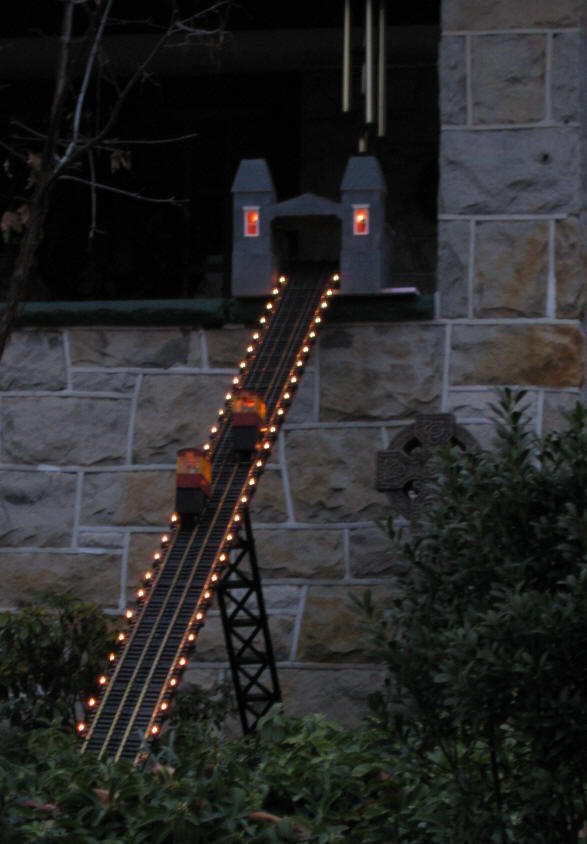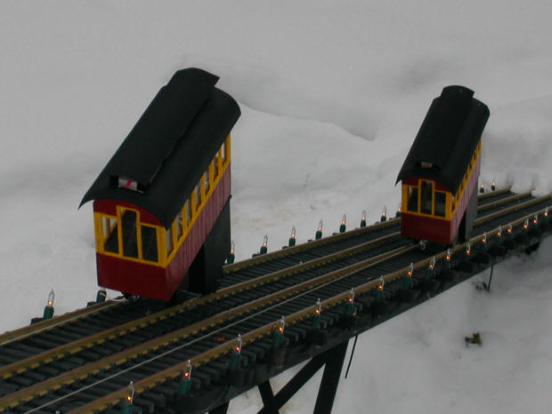 LIGHTING The lights along the sides of the track (all 56 of them) are from an inexpensive set of 200 Christmas tree lights. Since I didn't want 110 volts running through this system and since the spacing between the lights didn't fit my plans I cut the bulbs from the string and rewired them, extending the wires between bulbs to fit the track supports. Power is from a 17 volt AC transformer. I dimmed the bulbs a bit by wiring sets of 8 bulbs in series and then the 7 sets of 8 in parallel connected to the transformer. An additional set of 8 bulbs are in the building, 4 on each side. CONTROLLER The incline is controlled by a microprocessor based unit that I designed to control a point to point auto-reverse trolley. The controller runs the incline up and down based on time. The trip takes a bit over 90 seconds. The pause between trips is adjustable and normally is between 30 and 60 seconds. For details on the controller see: http://www.trainelectronics.com/ - the second item is the "Auto-Reverse Controller" I wasn't completely satisfied with the roof on the incline and the emery paper took a beating from the rain and snow that fell the first few weeks of December. The revised, and more prototypical, roof is make of a section of 4" plastic pipe that was cut on the table saw. I heated it up with a heat gun and shaped it a bit so that it more closely met the curve on the roof trusses on the car.
