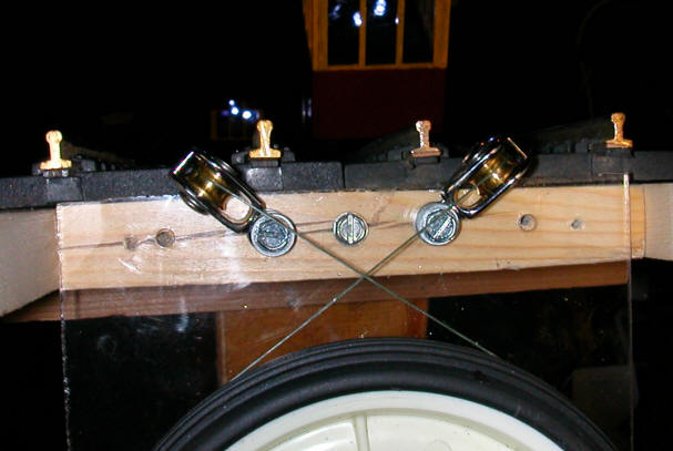 The braided fishing line "cable" is looped around the drive wheel only once. Having it crossed increased the pulling power considerably and the cars run very nicely now.