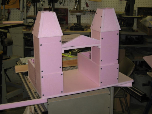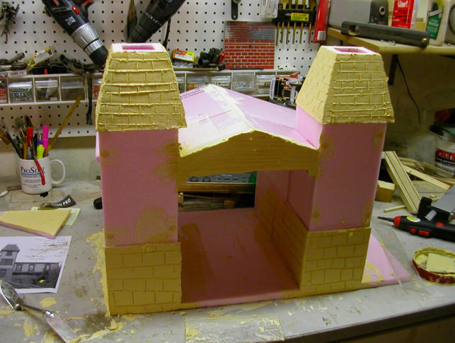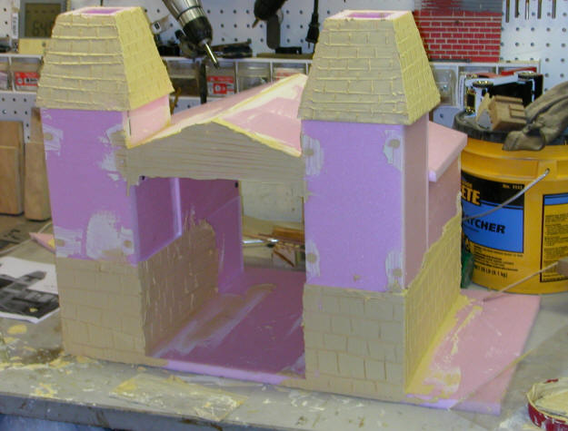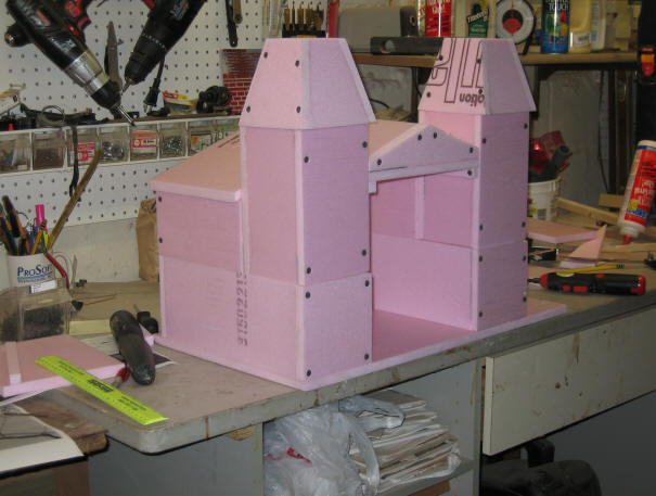 Here is it a little farther along - note the compound cuts to make the roof sections of each tower - great fun to figure out! The building will be coated with a thin layer of cement. When it is nearly dry texture for shingles, stone and siding added.