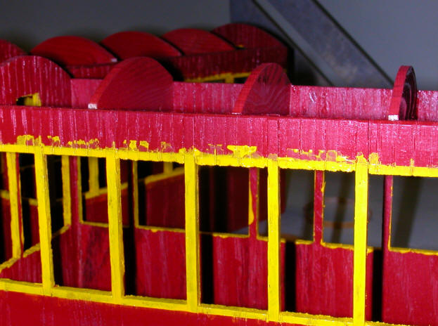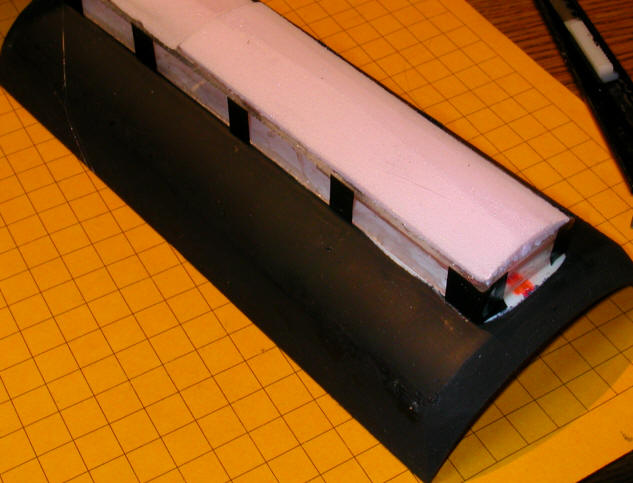 Black tape was added to make panes in the windows. Shaped pink foam was glued to the top of the clerestory to help the top roof section hold its shape. This roof was made of emery paper.