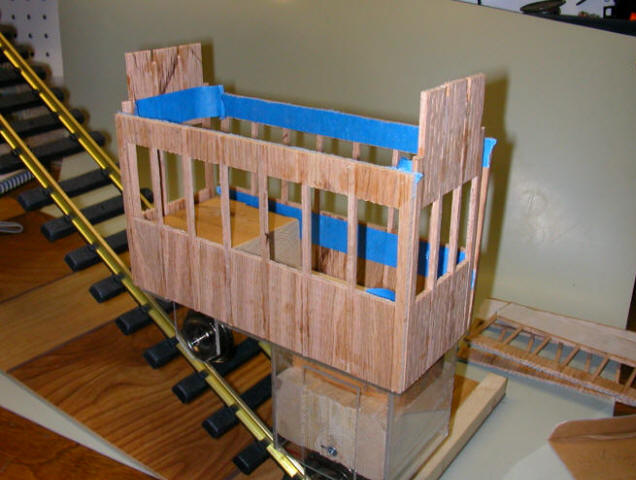 After cutting the ends to support the round roof and enlarging the center, end window the four sections that make up the car are glued together.