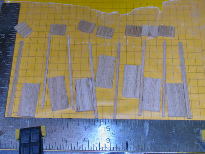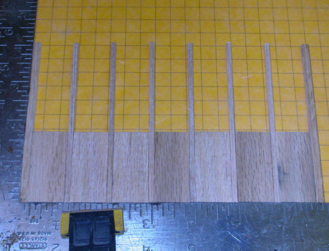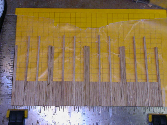 Below are the 22 pieces that were glued up for each side. Note the square used as a gluing jig & the wax and graph paper. This setup really helped.