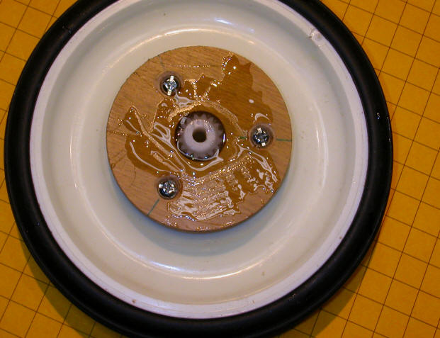 Luckily I had a gear that fit the keyed shaft of the motor. Here it has been glued to the center of an adapter wheel with epoxy. This holds the motor to the main 5" drive wheel that will move the incline's cable.