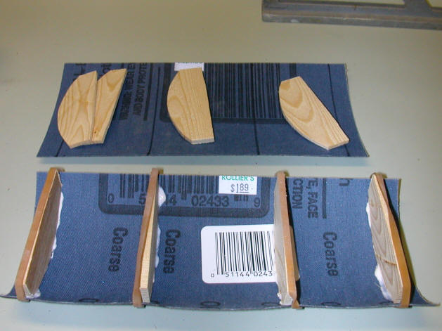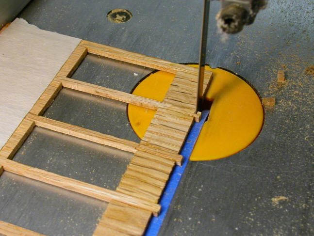 Additional roof trusses to properly curve the roof were cut with the band saw. Eight pieces were taped together & cut at once.