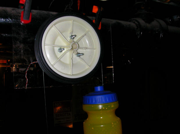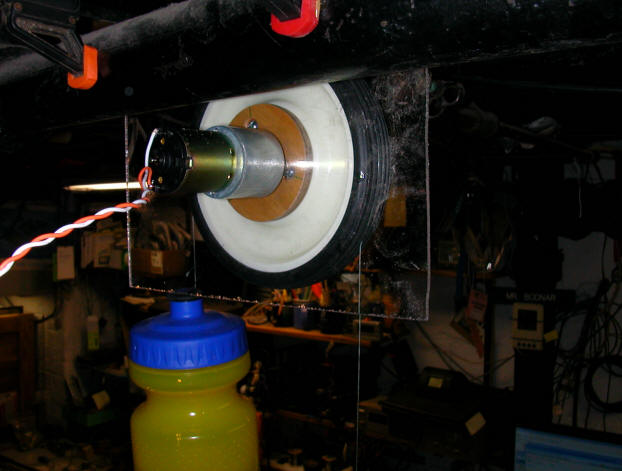 For testing the drive wheel and motor have been temporarily clamped to an overhead heating pipe. Two 1 pound water bottles are used for weights.